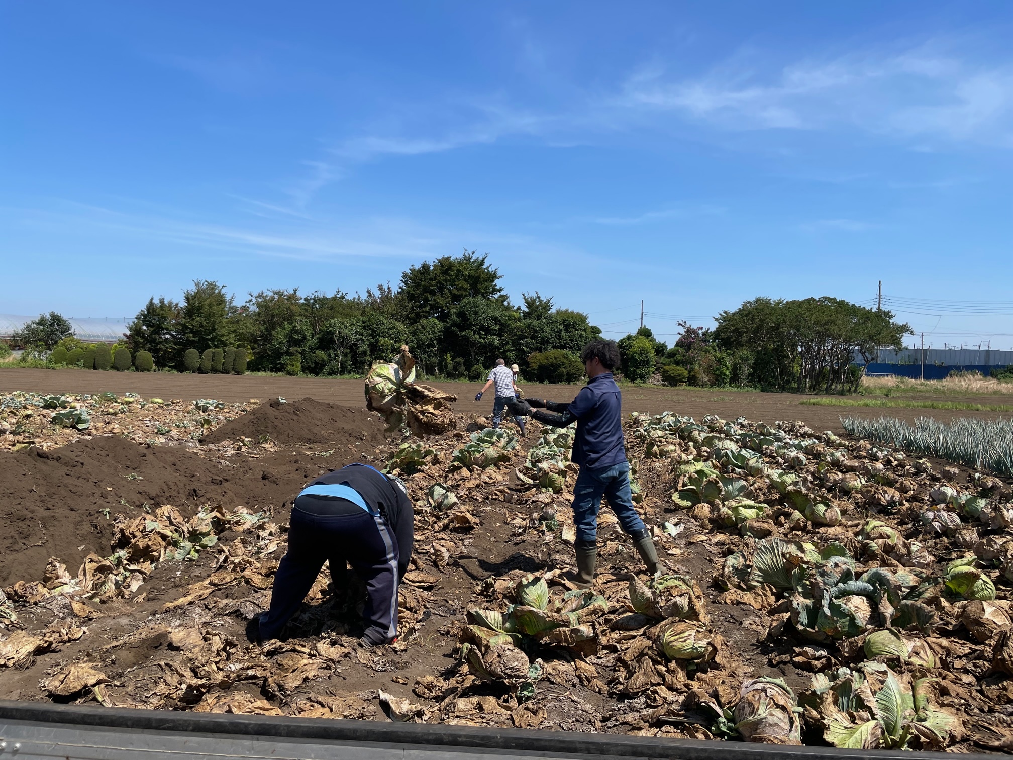 7/25(火)13代続く大和市福田の農家の冨田さんの指導のもと、大和市で初めてのお試しノウフクを実施しました。レインツリー鶴間事業所の利用者さん2名が、きゃべつ畑の後片付けにトライしました。